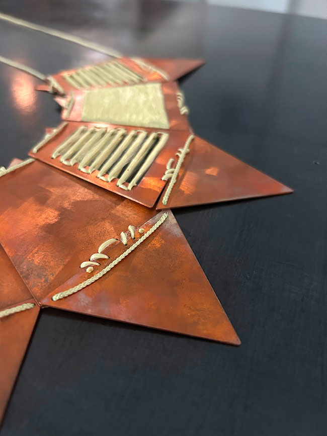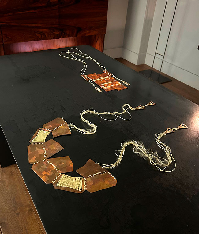 Her work combines copper with para-aramid thread (Kevlar), a technical material associated with resistance and protection. Through this combination, the pieces are constructed as systems of tension in which fragility and strength, exposure and protection remain in balance.